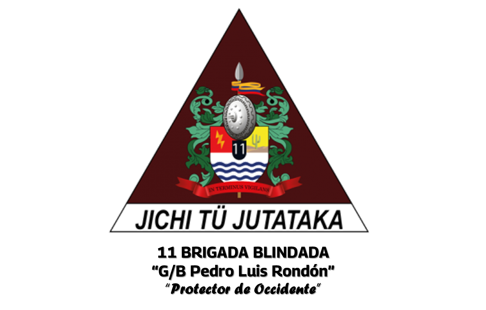 Sus Armas: Escudo sobre el todo con un once de plata, que representa la designación numérica de la Once Brigada Blindada. En el cantón diestro del escudo, una centella de oro sobre un campo de gules que simboliza el Relámpago del Catatumbo en representación del estado Zulia; y en el cuartel siniestro, unos médanos con un cardones al natural sobre un campo de oro que representan la geografía de nuestra Guajira Venezolana. En la punta, sobre un campo de plata, tres ondas de azul que representan las aguas del Lago de Maracaibo y el Golfo de Venezuela. En la base del triángulo, escrito en tinta negra sobre cinta de color blanco, la divisa en lengua Guayunaiki «JICHI TÜ JUTATAKA» (Punta de Libertad), por ser esta la primera Unidad Superior en activarse de acuerdo a los lineamientos de los planes enmarcados en la Tarea Libertad.