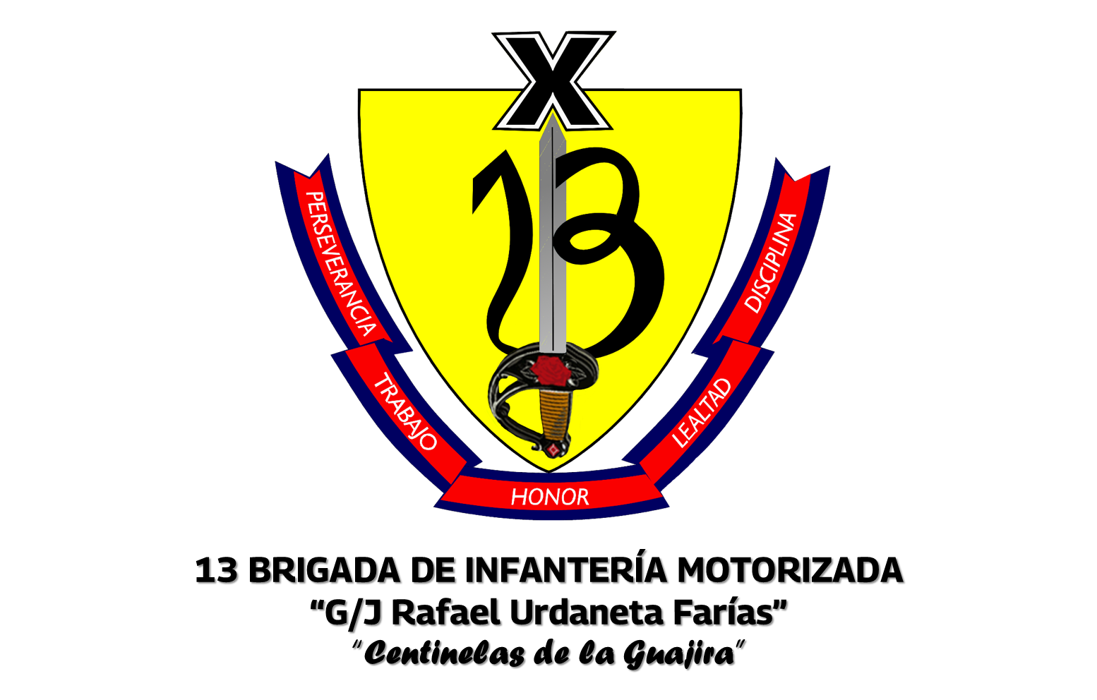 El escudo francés en oro, que significa al Arma de Infantería, simboliza el poder de la Batalla, el Jefe en Sable en forma de “X” incrustada, significa la magnitud de ésta Unidad Superior, la Bayoneta triunfante de Máuser, primer fusil moderno del Ejército Venezolano, en colores naturales, representa el arma de choque del Infante y simboliza la Fuerza y la Prudencia; entorchada a la bayoneta, cinta en Sable que forma el numero arábico 13, e identifica a la Unidad; la cinta de azul, rojo y azul, representa los colores de los uniformes que utilizó nuestro Ejército Libertador y significa el azul, la justicia, la nobleza, la perseverancia, la vigilancia y la lealtad; el Rojo significa la caridad, la magnitud, el honor, el valor, la victoria, el furor, la valentía , la generosidad y el vencimiento con sangre.
