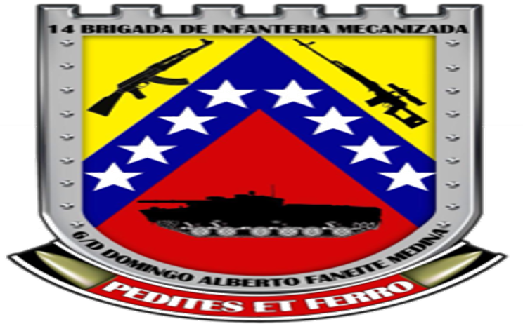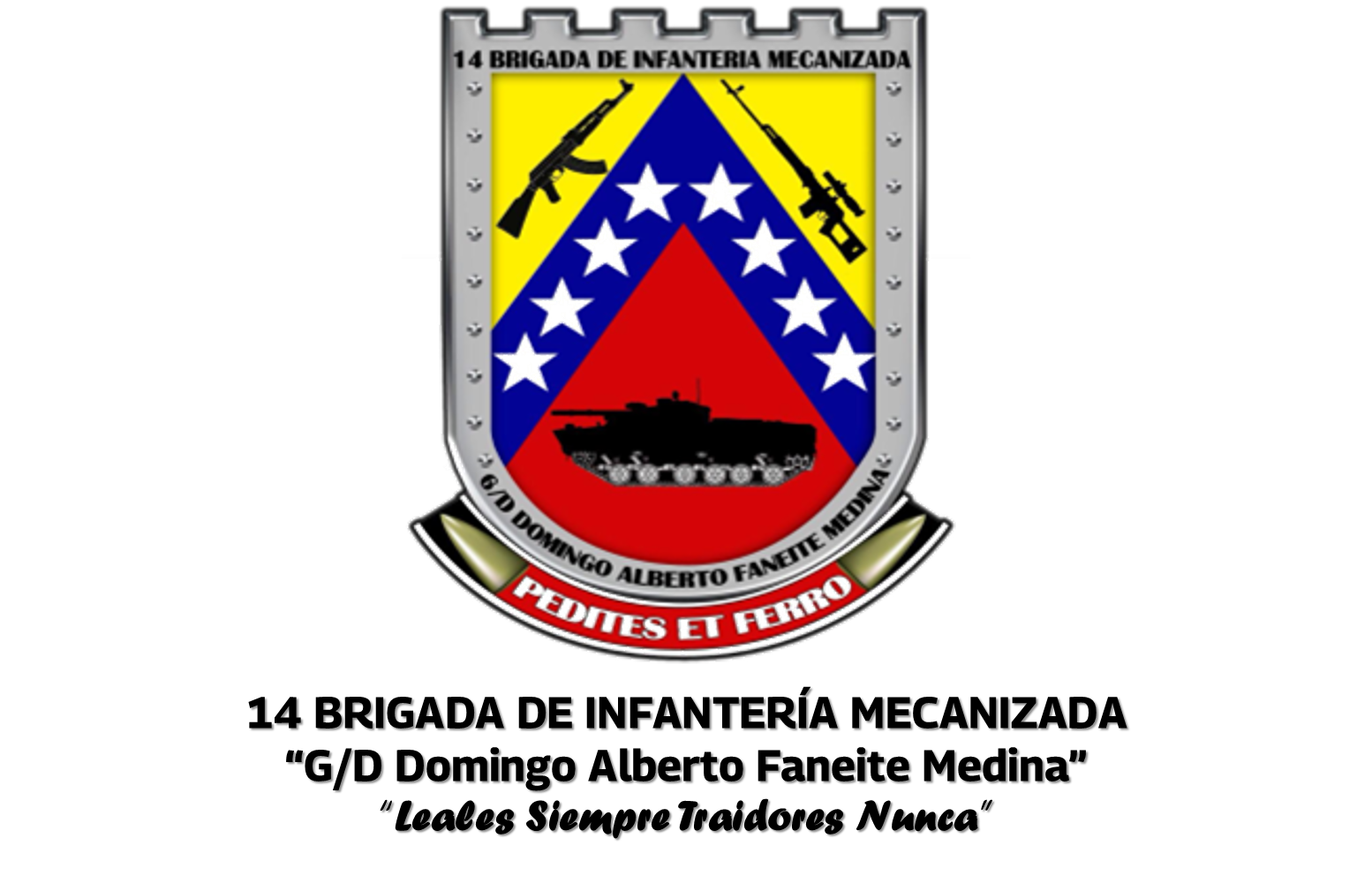 BLASONADO DEL ESCUDO: Blasón dividido en el centro por cinta cabreada azur estrellada en plata. Campo en un todo que representa la Patria, la Nación, la Bandera Nacional; rodeado de borde blocado de plata que es de Blindados. Sobre el campo, dos (2) cuarteles en oro en jefe, un cuartel azur cabreado, un cuartel en gules en punta. SIMBOLISMO: 1. El borde blocado de plata, representa la coraza de los Blindados. En jefe, en sable, la inscripción “14 Brigada de Infantería Mecanizada”; en punta, en sable, la inscripción “G/D Domingo Alberto Faneite Medina”, epónimo de la Unidad. 2. En cuartel derecho, en oro, en Jefe, fusil Kalashnikov en sable; en cuartel izquierdo; en jefe, en oro, fusil Dragunov en sable. 3. En cuartel azur, cabreado, ocho (8) estrellas en plata simbolizando la Patria como un todo. 4. En cuartel gules, en punta, tanque BMP-3 en sable, arma insignia de los Blindados. 5. El Todo simboliza: El arma blindados, punta de lanza del Ejército Bolivariano, heredero de las glorias y virtudes de nuestros Libertadores.
