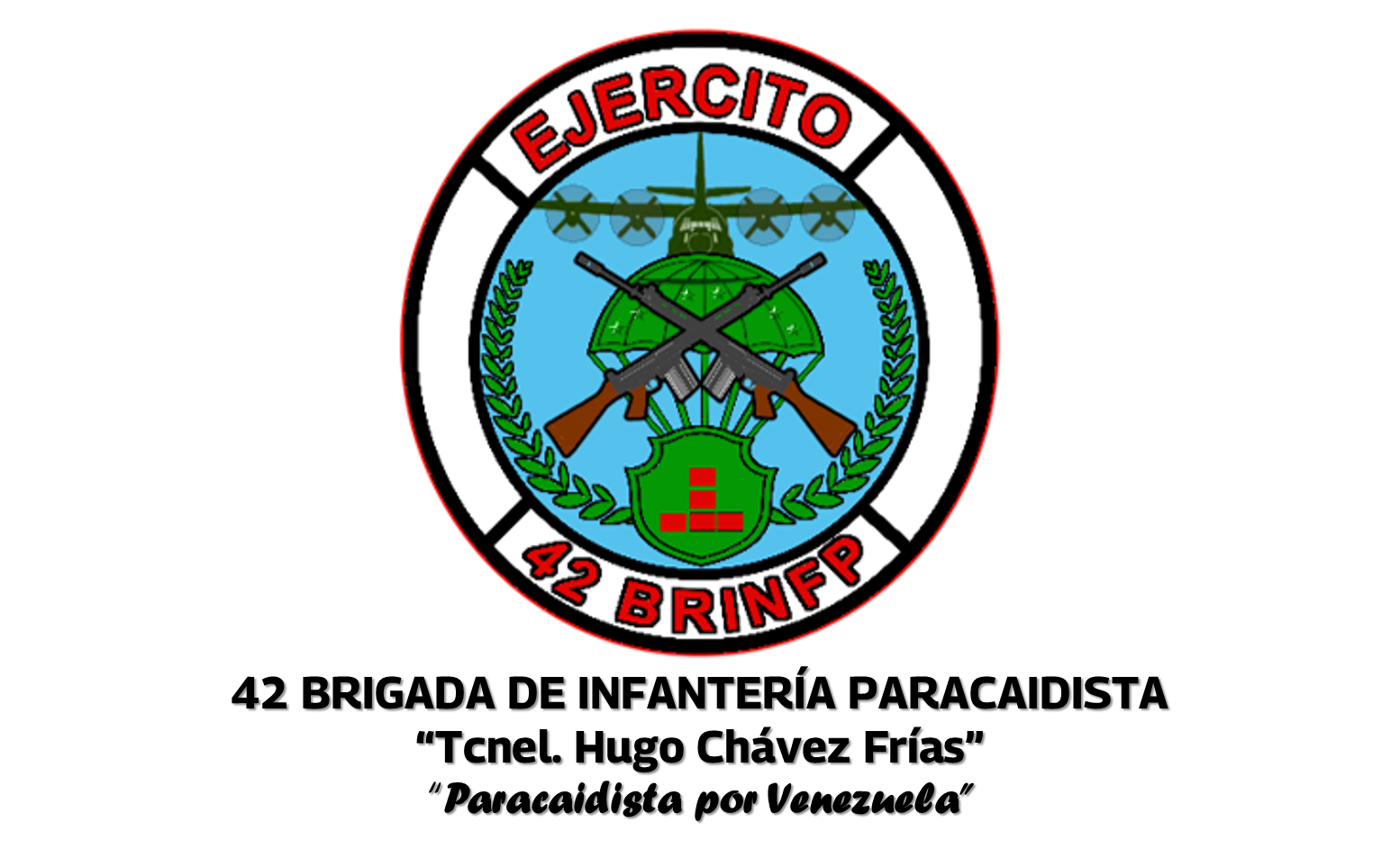 El emblema de la 42 Brigada de infantería paracaidista simboliza en sus colores el Paracaídas Avión de Vuelo, representando la acción guerrera y triunfante de sus unidades tácticas y de apoyo, en el desafío depender del nylon de un avión hasta la tierra. Los fusiles esmaltados en aspa sobre la canopia , identifica a las unidades aerotransportadas, que desde el infinito azul de nuestros cielos se trasladan y posteriormente descienden hasta un balizaje que indica la precisión del lanzamiento demostrado por los maestros de salto, en contorno negro del balizaje representa el luto eterno por los paracaidistas caídos en el campo de honor y el rojo vivo de los paineles, el reconocimiento a la sangre derramada por nuestros soldados en las acciones cumplidas por el deber militar. El fondo representa el área del balizaje, indica el dominio y control sobre nuestra geografía territorial como una unidad estratégica del ejército y honra el primer color utilizado por los paracaidistas en Venezuela.