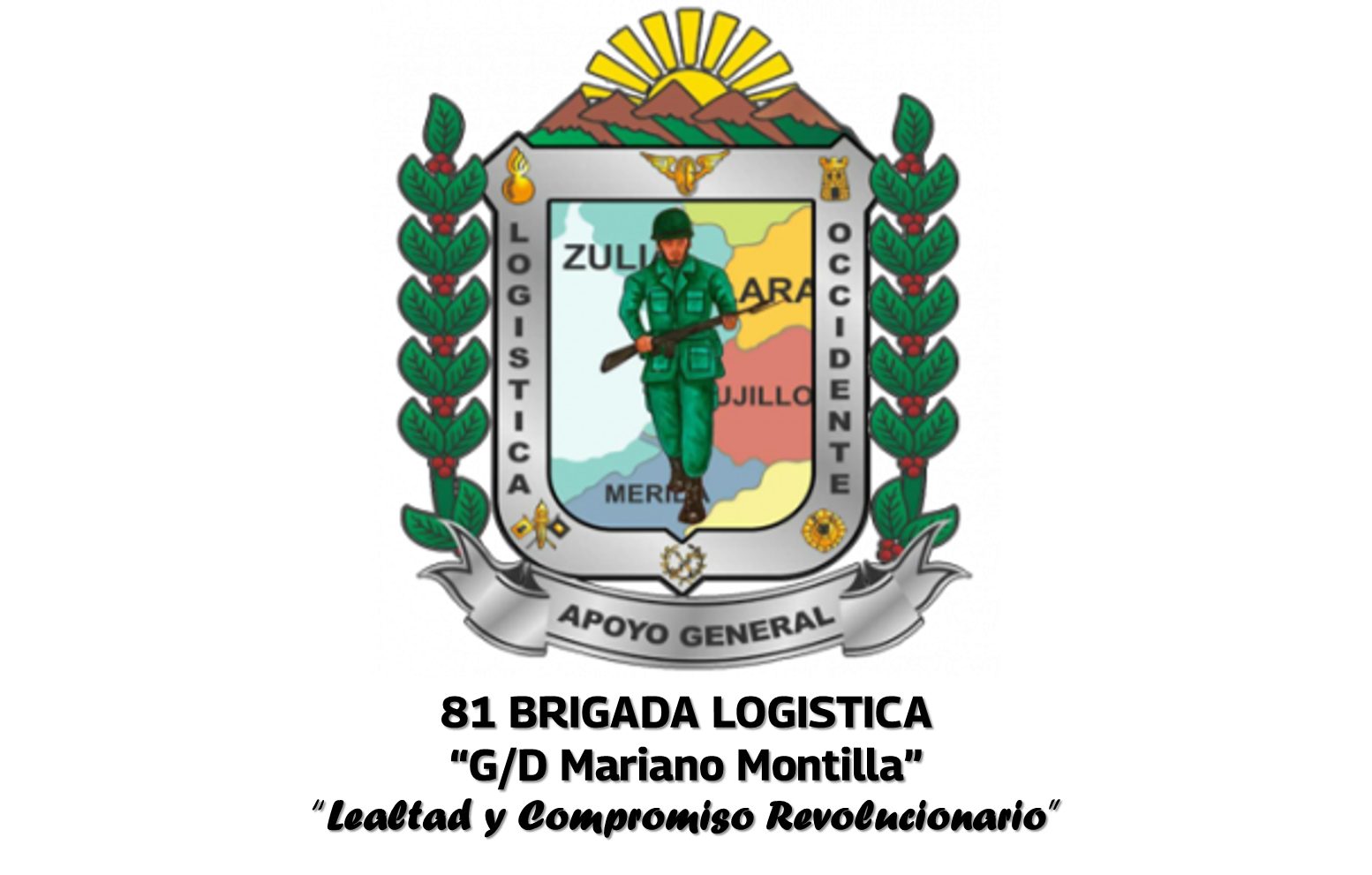 El Escudo que lleva en todo su campo la representación de Parcial de los estado Zulia, Mérida, Barinas, Trujillo, Lara, Falcón, entidades ubicadas al Occidente de Venezuela, donde funcionan las unidades a las cuales les brinda apoyo general la 84 Brigada Logística “G/D Mariano Montilla”. Al centro del campo la figura de un soldado del Ejército Bolivariano, al paso vivo, símbolo por excelencia de la institución armada. Alrededor del campo lleva bordura de gris que es el color que representa los servicios en el Ejército Bolivariano. En jefe y en punta, sobre la bordura, emblemas de los servicios que integran nuestra 84 Brigada Logística “G/D. Mariano Montilla”: Armamento, transporte e Ingeniería en el borde superior, y comunicaciones, sanidad e Intendencia, en el borde inferior. A la diestra, sobre la bordura, la inscripción en sable LOGÍSTICA, y a la siniestra, la inscripción, también en sable OCCIDENTE. Al timbre, las montañas de Terepaima, Edo. Lara, donde está ubicada permanentemente la unidad. Tras ellas el sol radiante del Occidente Venezolano. Las montañas son el símbolo de la fiereza, estabilidad y constancia que caracterizan al comando de la 84 Brigada Logística “G/D Mariano Montilla”, en el cumplimiento de sus funciones como unidad que proporciona apoyo logístico general. Completan el escudo, dos ramas de laurel que lo rodean por ambos lados, símbolo de la buena fama y de imperecedera victoria. Fuera del escudo en la barba del mismo, cinta gris ondeando que une a las ramas, la inscripción en sable: “APOYO GENERAL”.