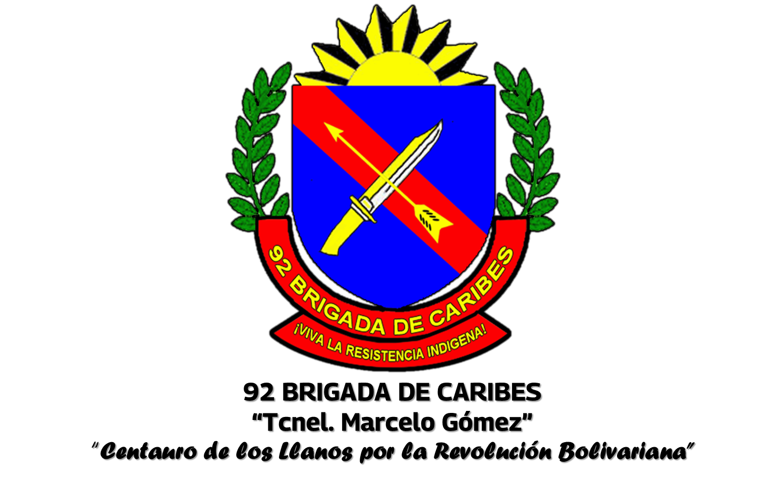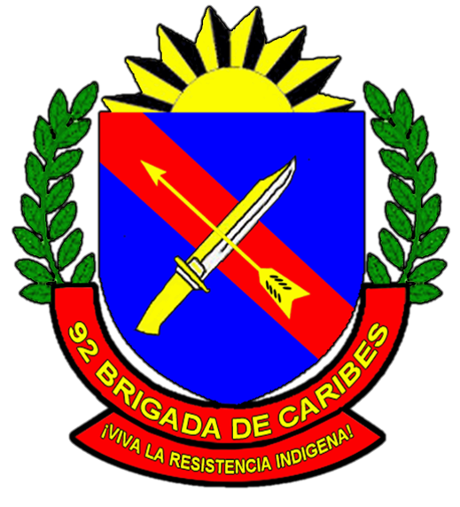El cuadrante principal se encuentra los colores azul y rojo que representa al Ejerció Bolivariano entrelazado con una flecha y un cuchillo de combate que representa la unión de nuestros indios caribe y el nuevo combatiente el soldado caribe, con una cinta roja con la palabra CARIBE. Los laureles Simboliza la victoria, la gloria, el mérito, el triunfo, el éxito y la grandeza de nuestros gurreros. En la parte superior un sol naciente que representa en nacimiento del nuevo Caribe, Combatiente, Autóctono, Revolucionario, Integral, Bolivariano, Especial En la parte inferior entre dos medio círculo de color rojo se inscribe el nombre de la unidad 92 Brigadas de Caribe y en el siguiente, viva la resistencia indígena, en honor a las batallas que libraron nuestros indígenas y a hora libramos los nuevos guerreros caribe.