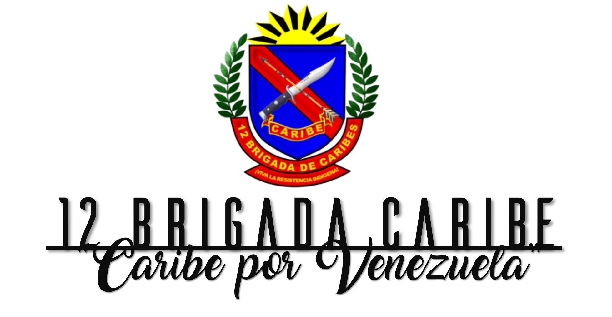 El cuadrante principal se encuentra los colores azul y rojo que representa al Ejerció Bolivariano entrelazado con una flecha y un cuchillo de combate que representa la unión de nuestros indios caribe y el nuevo combatiente el soldado caribe, con una cinta roja con la palabra CARIBE. Los laureles Simboliza la victoria, la gloria, el mérito, el triunfo, el éxito y la grandeza de nuestros gurreros. En la parte superior un sol naciente que representa en nacimiento del nuevo Caribe, Combatiente, Autóctono, Revolucionario, Integral, Bolivariano, Especial En la parte inferior entre dos medio círculo de color rojo se inscribe el nombre de la unidad 12 Brigada Caribe y en el siguiente, viva la resistencia indígena en honor a las batallas que libraron nuestros indígenas y a hora libramos los nuevos guerreros caribe.