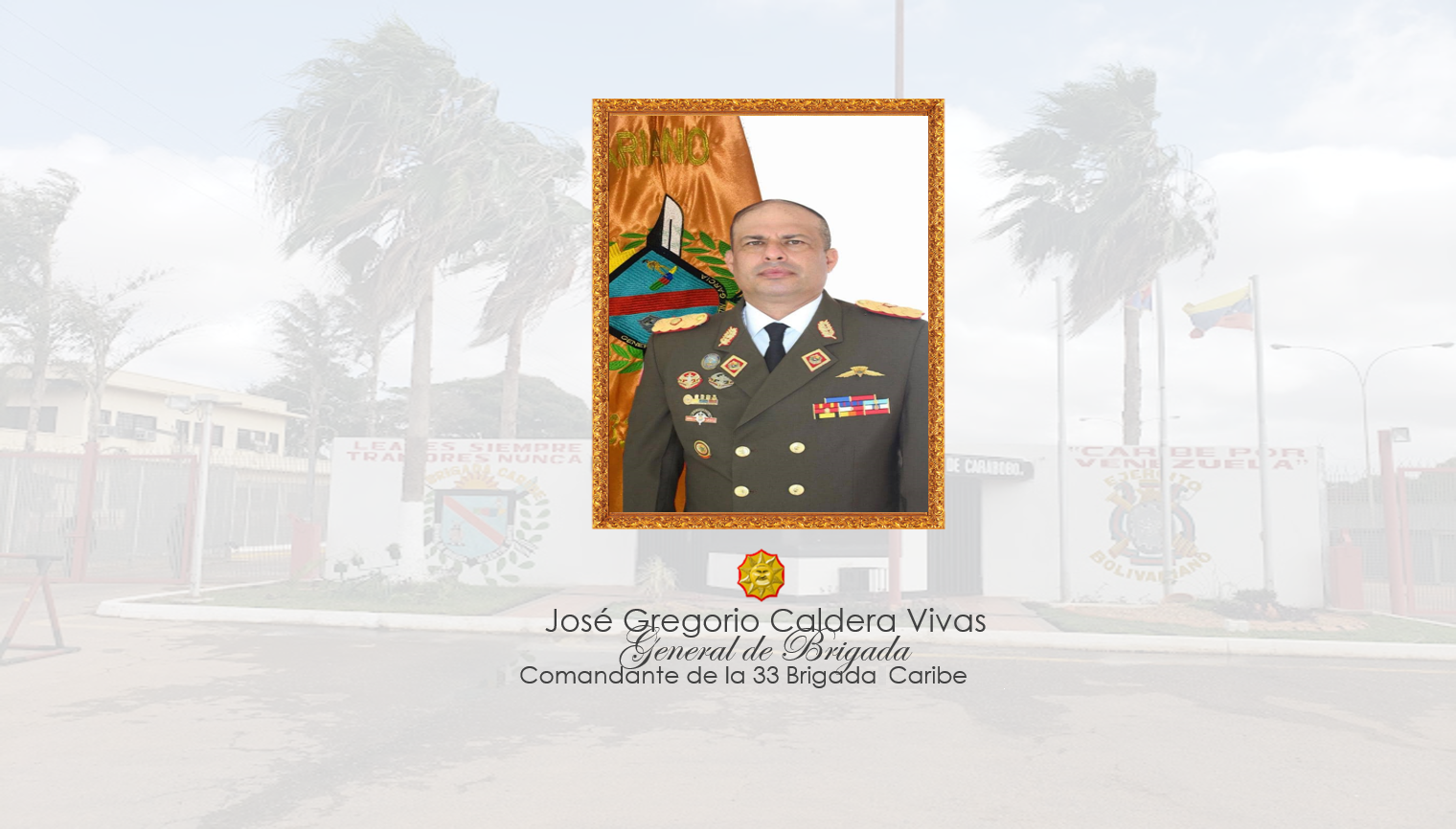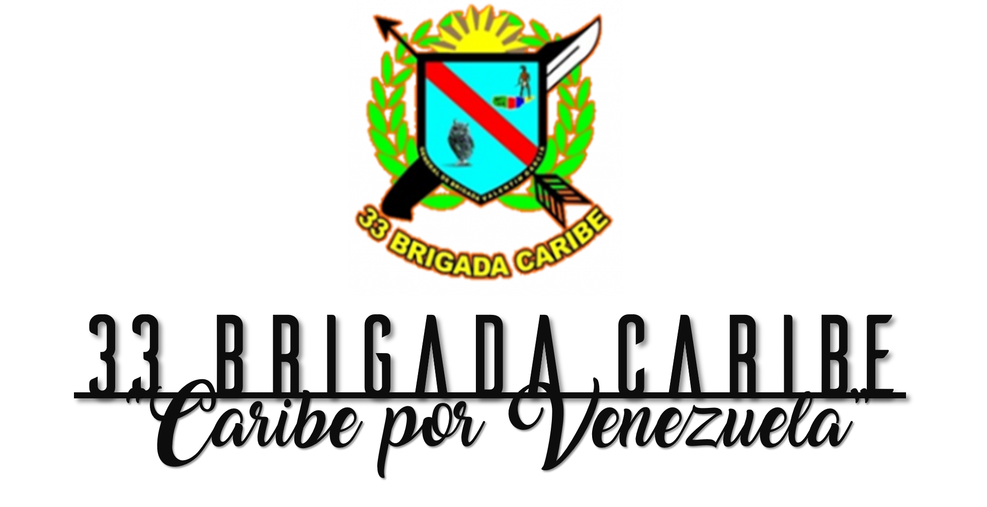 Como timbre se encuentra un sol naciente que simboliza el nacimiento de un pueblo que surge pleno de vigor y esperanza; de bordadura del escudo, en sable, la inscripción “General de Brigada Valentín García”. En un solo cuartel, un campo de azur cian, símbolo de las cualidades de justicia, obediencia, lealtad, piedad y prudencia, con la obligación al servicio de la patria, tronchado por una barra de gules que simboliza fortaleza, alteza, valor, honor, osadía y victoria con la obligación al servicio y protección de las armas del soberano y socorrer al oprimido. Se encuentra en su cantón siniestro del jefe, la figura del indígena caribe: aborigen de nuestra tierra caracterizado por su naturaleza guerrera e indómita; y justo bajo sus pies el mapa de la extensión de la faja petrolífera del Orinoco Hugo Chávez, dividida en sus cuatro bloques de producción, sobre los cuales ejerce su protección y resguardo. En el cantón diestro de la punta del escudo, la lechuza: ave predominante en los bosques del oriente venezolano y que simboliza sabiduría y erudición; capaz de ver donde el resto solo percibe oscuridad, conocimiento de lo que no resulta evidente y de lo que pasa desapercibido. Como tenantes tenemos surmontado el cuchillo de combate y la flecha: que representan de la soberanía y dominio del linaje ancestral de aborigen caribe y la unión de nuestros indios caribes y el nuevo combatiente: el soldado caribe; a los laterales las ramas de laureles que representan la bravura y la victoria que demarcan la vida del insomne soldado caribe. Como divisa, la inscripción 33 Brigada Caribe, en color oro, color que simboliza la nobleza, esplendor, prosperidad, sabiduría, magnanimidad, constancia, riqueza, poder y luz. Quien lo lleva se caracteriza por su nobleza y ser primero en defender y portar las virtudes de caballero, amparar a los necesitados y defender al soberano, peleando por ellos hasta derramar su última gota de sangre.