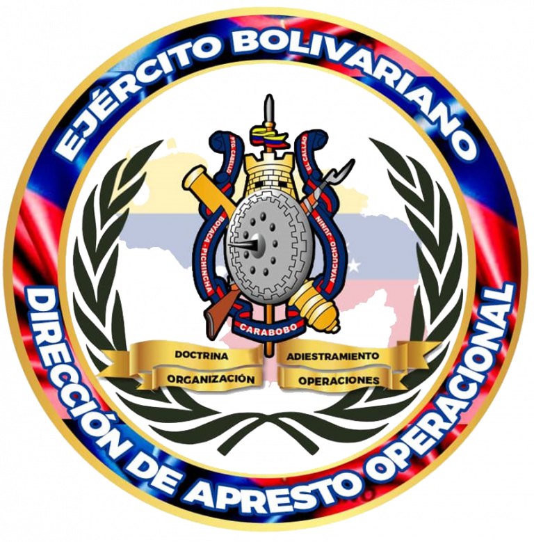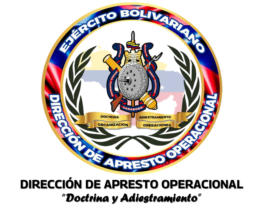 El escudo de armas de la Dirección de Apresto Operacional del Ejército Bolivariano, constituido en un escudo circular con los colores azul y rojo, que representan nuestro glorioso estandarte del Ejército Bolivariano, que simboliza a todas y cada una de las Unidades de nuestro Ejército Bolivariano. En la parte superior del escudo se ubica sobre blanco y borde azul, el nombre de la Dirección de Apresto Operacional del Ejército Bolivariano. En punta la figura tricolor en silueta filierada en sinople, del mapa de la Republica Bolivariana de Venezuela, en representación del alcance que tienen las operaciones militares a lo largo y ancho de todo el territorio nacional, donde sean requeridas, de igual manera nos indica nuestra soberanía patria, dando a entender que ningún país del mundo podrá vulnerar nuestra soberanía sin enfrentarse al poder del Ejército Bolivariano. Lleva incrustado en la parte inferior del Escudo del Ejército Bolivariano, dos cintas en doble onda hacia arriba, de color dorado donde se inscriben las funciones de la Dirección de Apresto Operacional del Ejército Bolivariano, en sable negro a razón de izquierda a derecha, doctrina, adiestramiento, organización y operaciones. Así mismo y dentro del escudo circular de color dorado se encuentra una bordura exterior de dos ramas de hojas de encima, que significan la bravura y la tenacidad del Soldado Venezolano, para proteger y defender la Nación.