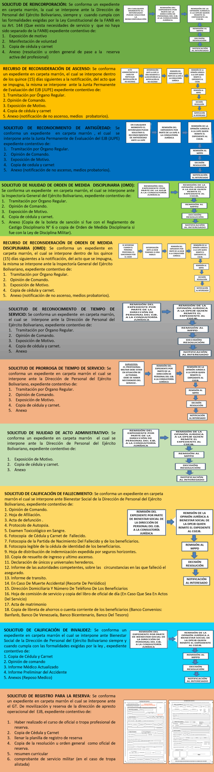 - Asesorar y emitir opiniones jurídicas legales de reconsideración de ascenso, reconocimiento de antigüedad, reconocimiento de tiempo de servicio, nulidad de orden de medida disciplinaria, calificación de fallecimiento, calificación de invalidez y reincorporación entre otras al Comando General del Ejército Bolivariano, dependencias de la Comandancia General del Ejército Bolivariano y otras dependencias administrativas o unidades operativas, previa solicitud.