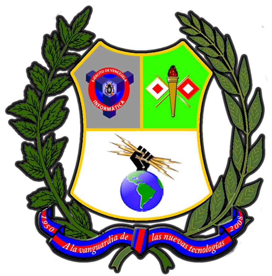 Escudo italiano cortado y medio partido, esmaltado primero de gris, característicos de los servicios en el Ejército Venezolano y en su centro, el símbolo que identifica a la informática en nuestro componente; segundo de sinople (verde manzana), esmalte que simboliza de las virtudes la amistad, el servicio y el respeto, en representación del arma, y en su centro en aspa las banderas plata y gules, con la antorcha, símbolo universal por excelencia de las comunicaciones; tercero de plata (blanco), integridad, firmeza y vigilancia, el globo terráqueo con una mano en sable (negro), que atrapa con fuerza tres rayos en oro, símbolo del poder del espectro electromagnético. Trae filiera de oro y como ornamento exterior ramas de olivo y laurel en su color natural, atadas en punta por una cinta ondeante tricolor, azur, gules, azur, simbolizando el Ejército, con la inscripción del lema en plata: «A la vanguardia de las nuevas tecnologías» y a ambos extremos las fechas 1950-2008, hitos en la historia de las comunicaciones militares en el Ejército Venezolano.