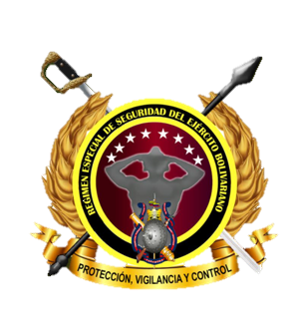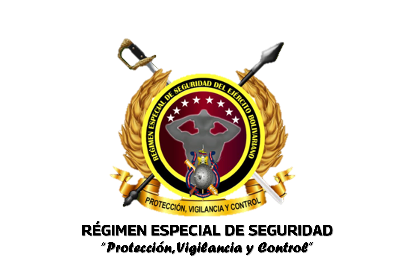 Rodeando el círculo central, aparece una banda circular dorada con la leyenda “REGIMEN ESPECIAL DE SEGURIDAD DEL EJÉRCITO BOLIVARIANO” en letras mayúsculas y en estilo formal, inscrita a lo largo del borde.